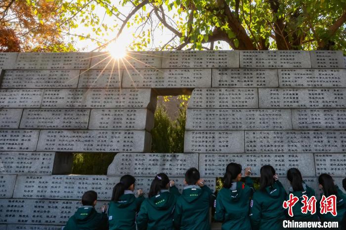 12月1日,南京大屠杀死难者家庭祭告活动在侵华日军南京大屠杀遇难同胞纪念馆举行。阳光下,南京市中小学的孩子们为遇难者名单墙描新。中新社记者 泱波 摄